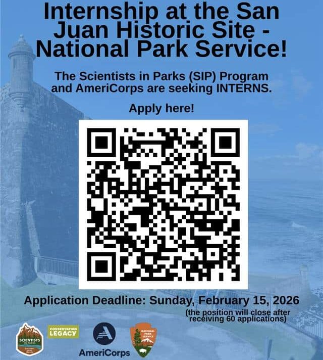 El San Juan National Historic Site (SJNHS) informa que su programa de internados continúa y ha sido reabierto con más semanas disponibles, brindando una oportunidad única para estudiantes, recién graduados/as y profesionales en etapa inicial interesados en adquirir experiencia práctica en áreas como ciencias ambientales y animales, vida silvestre, veterinaria, silvicultura, ecología urbana y comunicación científica.
