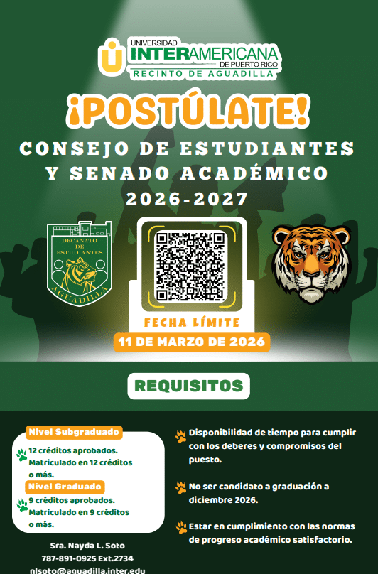 Adjunto a este mensaje encontrarán la promoción oficial con los requisitos para someter candidatura. Los estudiantes interesados tendrán hasta el 11 de marzo de 2026 para radicar su candidatura a través del código QR incluido en la promoción o el siguiente enlace: https://forms.office.com/r/PUgaxHwEXf