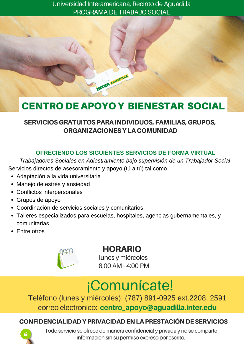 El Programa de Trabajo Social cuenta con un centro dirigido a la atención de estudiantes universitarios, estudiantes de escuelas públicas, estudiantes de escuelas privadas y comunidad en general. El fin es trabajar con el bienestar de las personas que requieren los servicios del Centro. En el Centro los y las estudiantes de práctica son los y las encargadas de trabajar las situaciones bajo la supervisión de la instructora de práctica profesional. El Centro es una forma de aprender haciendo lo más que disfrutan nuestros y nuestras estudiantes que es trabajar a favor del bienestar de las personas más vulneradas.